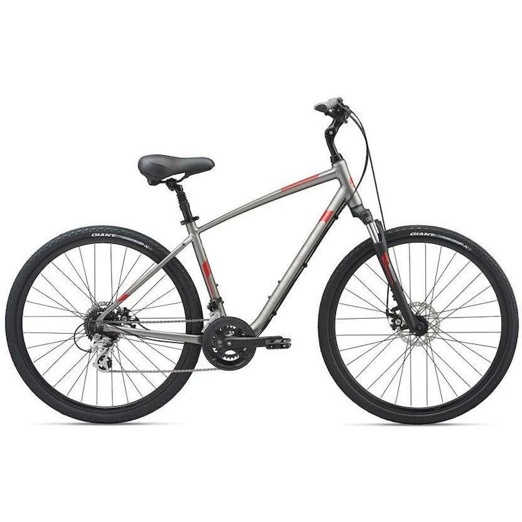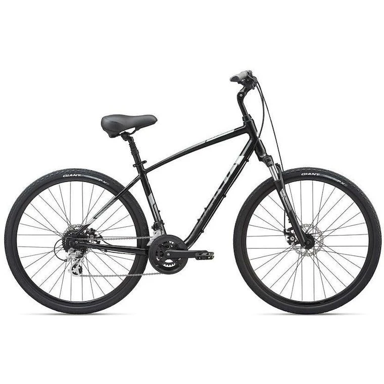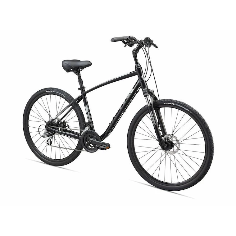 Smooth-rolling 700c wheels give the Giant Cypress DX Disc Hybrid bike a comfortable ride, even when things get a little bumpy. The suspension seatpost soaks up shocks, and the ALUXX aluminum frame provides a comfortable, upright ride. You can take it on roads or bike paths, even some dirt. Just keep pedaling and enjoy the ride.